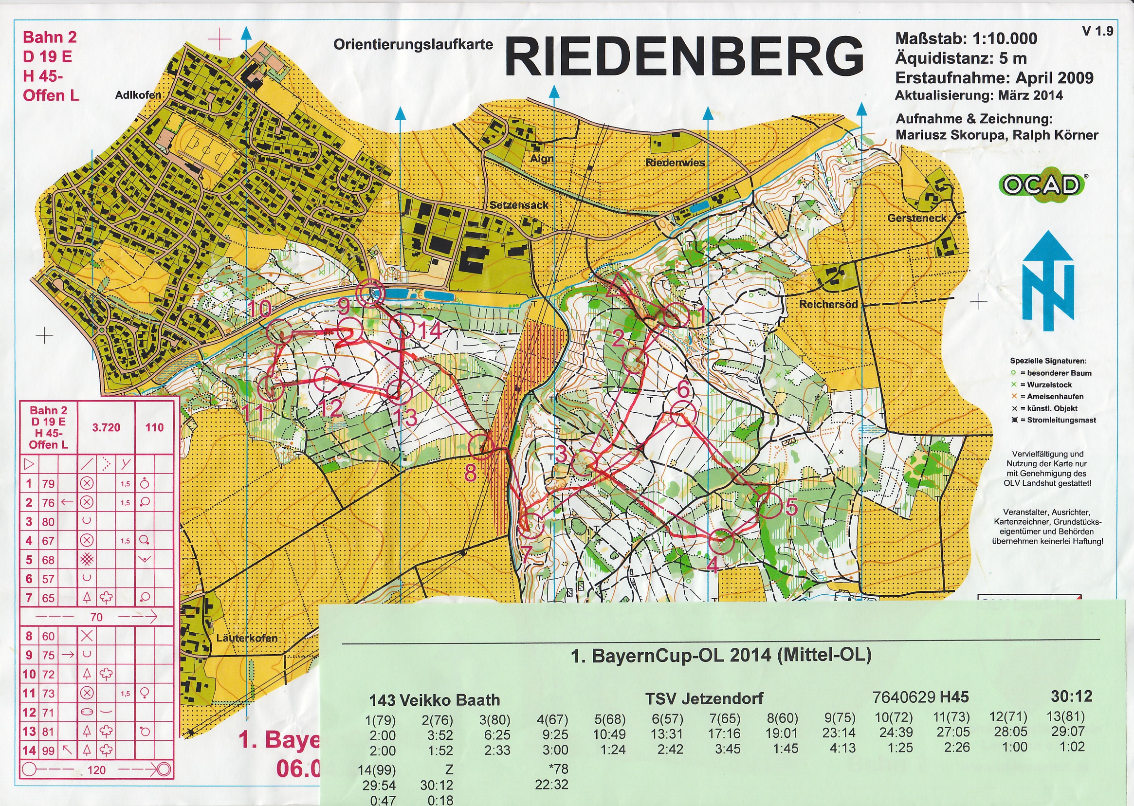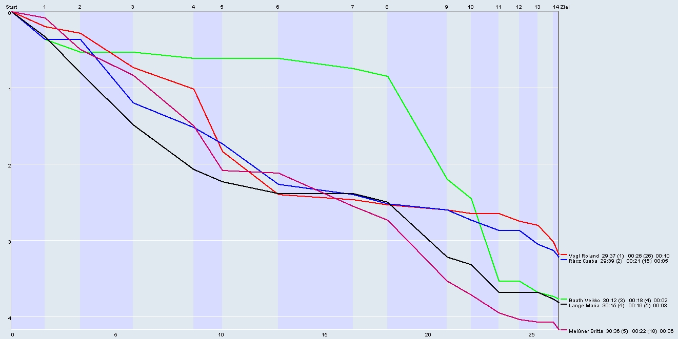 Bemerkung | H 45- (20) 3.7 km 110 Hm 14 P 1 Vogl Roland 68 SV Mietraching 29:37 2 Rácz Csaba 66 OLV Landshut 29:39 3 Baath Veikko 64 TSV Jetzendorf 30:12 4 Liebl Siegfried 65 TV Osterhofen 33:25 5 Zoltner Helge 62 OLV Landshut 34:01 6 Hartung Clemens 63 OLG Regensburg 34:48 7 Casanova Valerio 66 OLG Regensburg 35:05 8 Lexen Dieter 65 OLG Regensburg 35:30 9 Hofmann Roger 63 TSV Feldafing 36:07 10 Cionoiu Gheorghe 61 TV 1894 Coburg-Neuses 36:50 11 Malde Ketil 69 OC München 39:58 12 Kolehmainen Ari 62 OC München 41:50 13 Voskamp Eckart 66 OC München 42:17 14 Indola Patrik 67 OLG Regensburg 43:56 15 Weigold Robert 60 MTV Bamberg 44:05 16 Nürnberger Erich 63 OLG Regensburg 44:18 17 Helling Roger 61 MTV Bamberg 45:12 18 Seeger Guido 60 Baiersdorfer SV 45:42 19 Huber Klaus 60 OLV Landshut 51:12 20 Nikolaus Liviu 60 MTV Bamberg 55:47 |